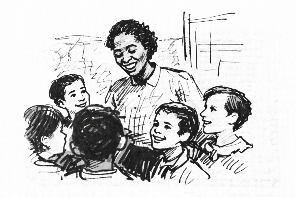 Pic.1. Speculative sketch, “Thyra Edwards with Soviet children in 1934,” 2025. All sketches in this series, Black-Eurasian Encounters, are imaginative reconstructions created by the author with AI assistance and are not based on historical photographs of the depicted scenes.