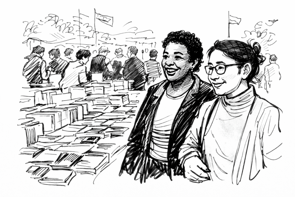 Pic.2. Speculative sketch, “Audre Lorde and Antonina Kymytval’ at book affair in Tashkent in 1976,” 2025. All sketches in this series, Black-Eurasian Encounters, are imaginative reconstructions created by the author with AI assistance and are not based on historical photographs of the depicted scenes.