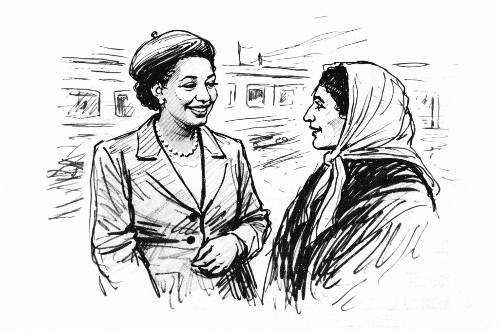Pic.6. Speculative sketch, “Group scene with Alice Childress in Tashkent in 1971,” 2025. All sketches in this series, Black-Eurasian Encounters, are imaginative reconstructions created by the author with AI assistance and are not based on historical photographs of the depicted scenes.