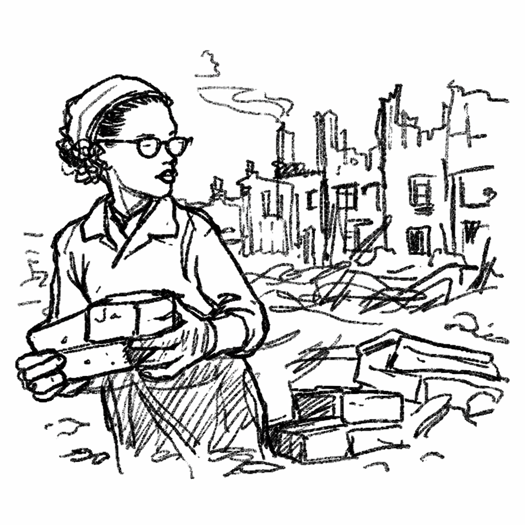 Pic.4. Speculative sketch, “Esther Cooper Jackson: Restoring Stalingrad in 1946,” 2025. All sketches in this series, Black-Eurasian Encounters, are imaginative reconstructions created by the author with AI assistance and are not based on historical photographs of the depicted scenes.