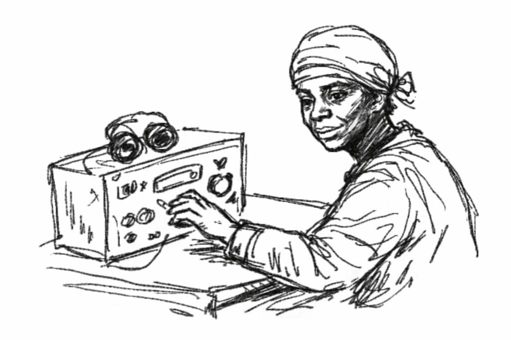 Pic.7. Speculative sketch, “Williana Burroughs at the radio controls during 1934-1945,” 2025. All sketches in this series, Black-Eurasian Encounters, are imaginative reconstructions created by the author with AI assistance and are not based on historical photographs of the depicted scenes.