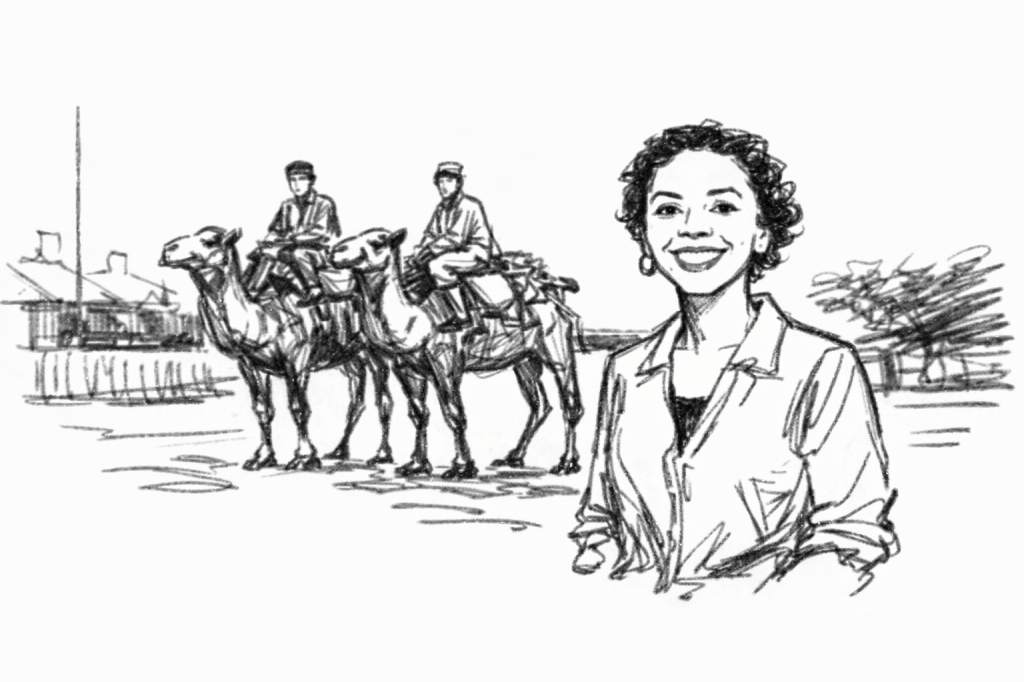 Pic.8. Speculative sketch, “Louise Thompson Patterson enroute to Uzbekistan in 1932,” 2025. All sketches in this series, Black-Eurasian Encounters, are imaginative reconstructions created by the author with AI assistance and are not based on historical photographs of the depicted scenes.